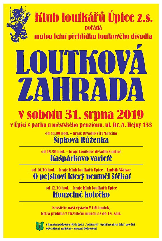 Klub loutkářů Úpice z.s. pořádá malou letní přehlídku loutkového divadla Loutková zahrada v sobotu 31. srpna 2019 v Úpici v parku u městského penzionu, ul. Dr. A. Hejny. Další informace a program na plakátě.