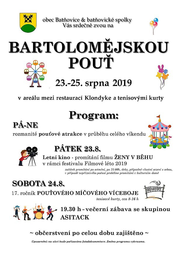 Obec Batňovice Vás srdečně zve na Bartolomějskou pouť. Bohatý program, pouťové atrakce i večerní zábava a mnohem víc! Program a další informace naleznete na plakátu.