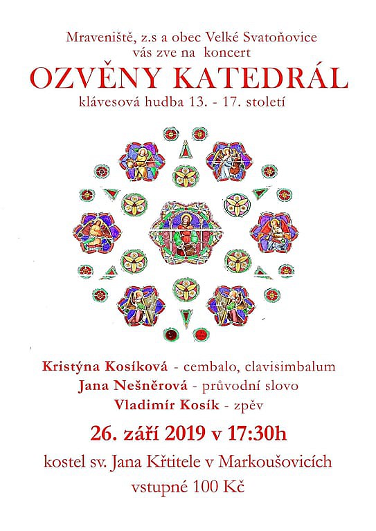 Mraveniště, z.s. a obec Velké Svatoňovice vás zvou na koncert Ozvěny katedrál. Koncert se koná ve čtvrtek 26. 9. 2019 od 17:30 hodin v kostele sv. Jana Křtitele v Markoušovicích. Slovem provede Jana Nešněrová, na cembalo a clavisimbalum zahraje Kristýna Kosíková, zpěv Vladimír Kosík. Vstupné 100 Kč.