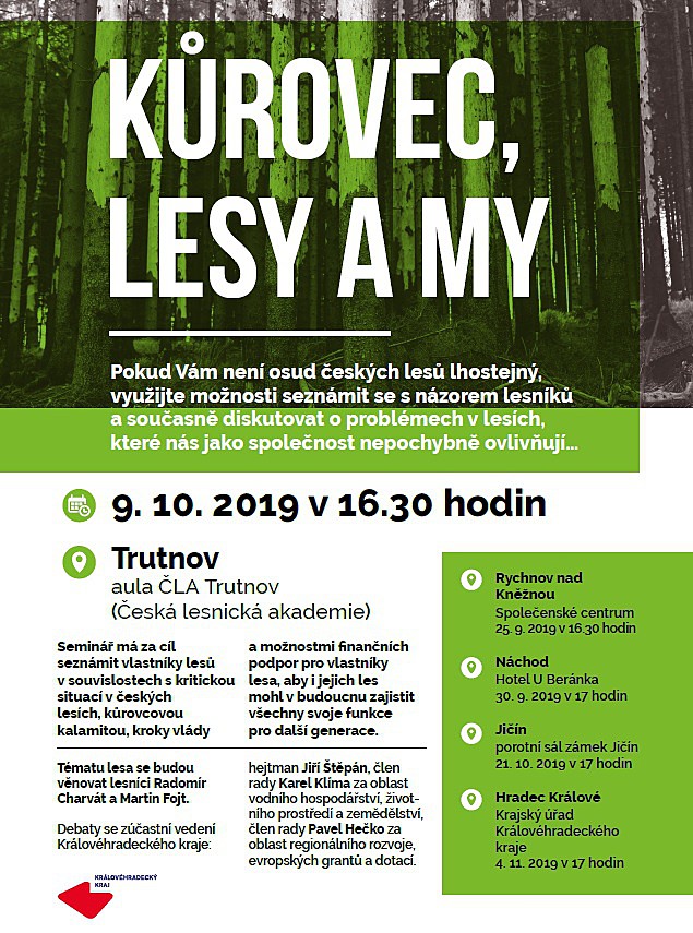 Hejtman Královéhradeckého kraje Jiří Štěpán zve širokou veřejnost na seminář k problematice kůrovce, který se koná ve středu 9. října 2019 v aule České lesnické akademie v Trutnově od 16:30 hodin.