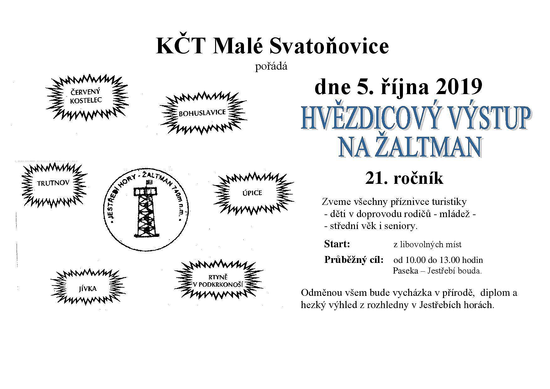 KČT Malé Svatoňovice zve všechny příznivce turistiky na Hvězdicový výstup na Žaltman. Startuje se v sobotu 5. října 2019 z libovolných míst - Bohuslavice, Úpice, Rtyně v Podkrkonoší, Jívka, Trutnov, Červený Kostelec. Průběžný cíl mezi 10:00 a 13:00 hodinou na Pasekách, Jestřebí boudě.