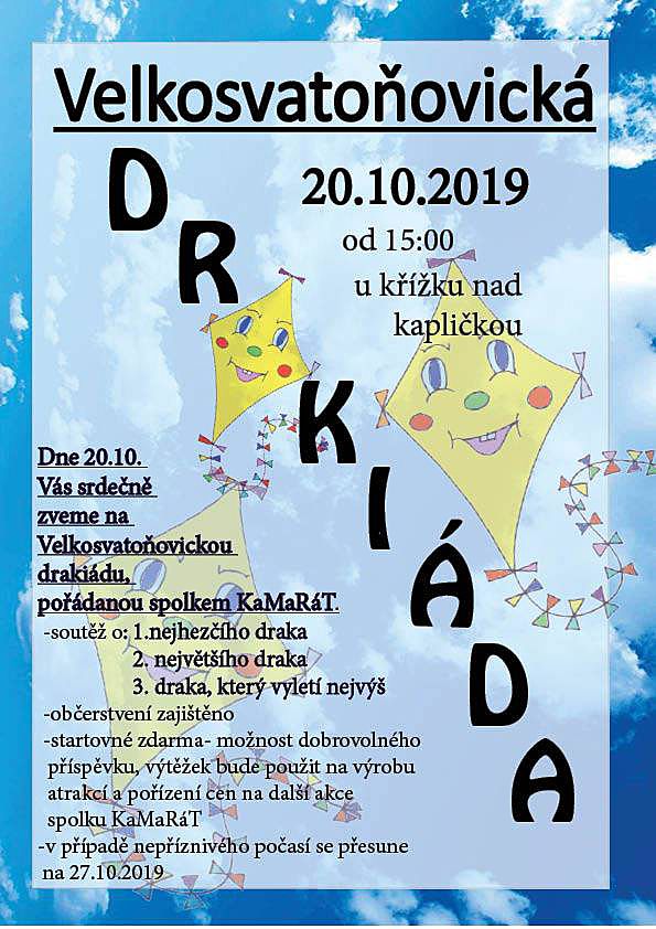 Spolek KaMaRáT Vás srdečně zve na Velkosvatoňovickou drakiádu, která se koná v neděli 20. října 2019 od 15:00 hodin u křížku nad kapličkou. Bude se soutěžit o nejhezčího draka, největšího draka a draka, který vyletí nejvýš. Občerstvení zajištěno. V případě nepříznivého počasí se akce přesune na 27. října 2019.