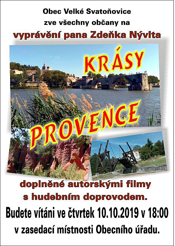 Přednáška doplněná autorským filmem s hudebním doprovodem p. Nývlta „Krásy Provence“ v zasedací místnosti Obecního úřadu. Video ve vysoké kvalitě, špičkový zvuk. Plátno o úhlopříčce 3 metry. Přijďte ve čtvrtek 10. října 2019 v 18:00 hodin.