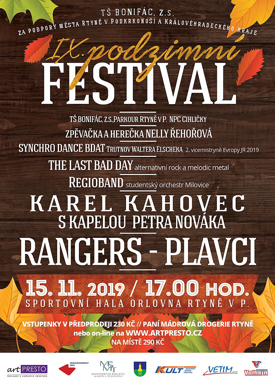 V pátek 15. listopadu 2019 proběhne ve Rtyni v Podkrkonoší již IX. podzimní festival, na kteý vás zve Taneční škola Bonifác, z.s. Vstupenky v předprodeji 230 Kč. Program a další informace naleznete na plakátě.