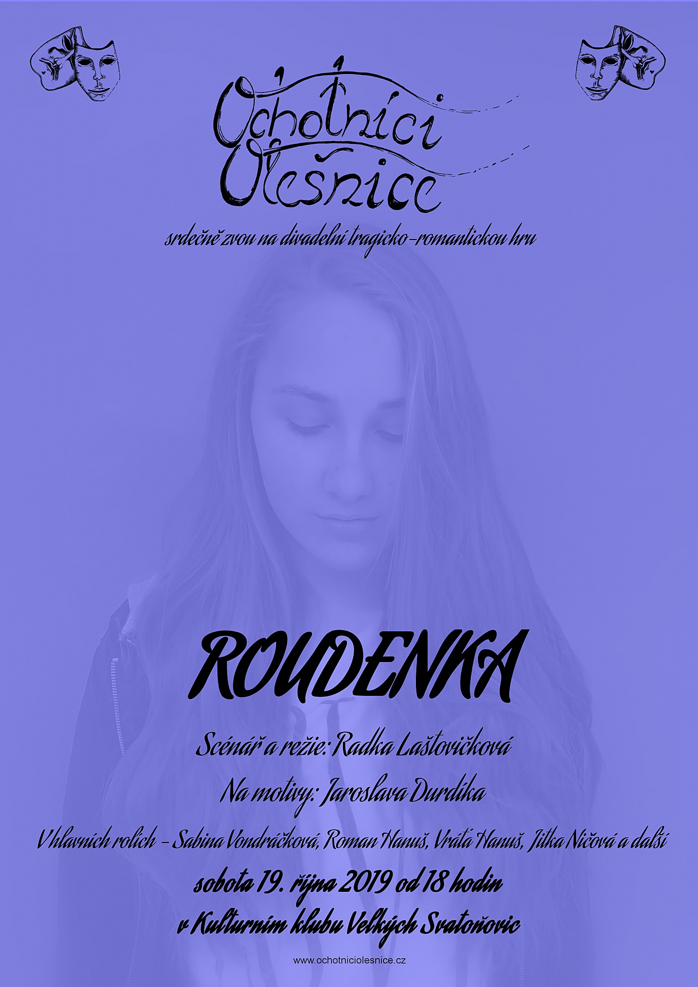 Ochotíci Olešnice vás srdečně zvou na divadelní tragicko-romantickou hru Roudenka. Představení můžete shlédnout v Kulturním klubu Velkých Svatoňovic v sobotu 19. října 2019 od 18:00 hodin.