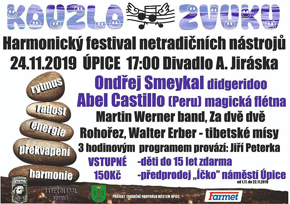Kouzlo zvuku aneb harmonický festival netradičních nástrojů. Těšíme se na Vás v neděli 24. 11. 2019 od 17:00 hodin v divadle Aloise Jiráska v Úpici. Vystoupí speciální host Ondřej Smeykal, hráč na didgeridoo a mnoho dalších originálních hudebníků s ještě originálnějšími hudebními nástroji. Vstupenky v předprodeji v Informačním turistickém centru Úpice.