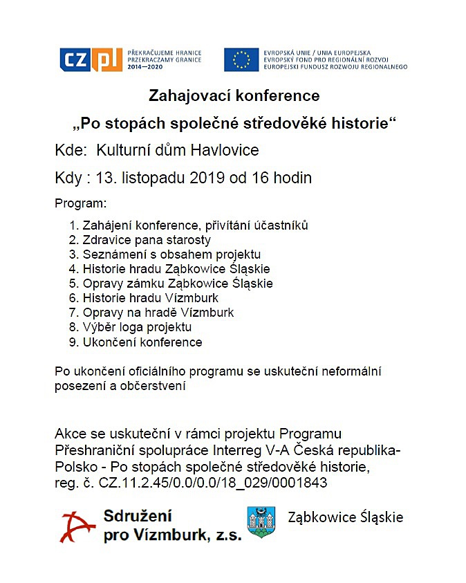 Ve středu 13. 11. 2019 se v kulturním domě v Havlovicích můžete dozvědět zajímavé informace o Česko-polském projektu "Po stopách společné středověké historie" a současně také o hradech Vízmburk a Zabkowice Slaskie. Programem provede Mgr. Jaroslav Balcar a polští kolegové. Konference začíná v 16:00 hodin.