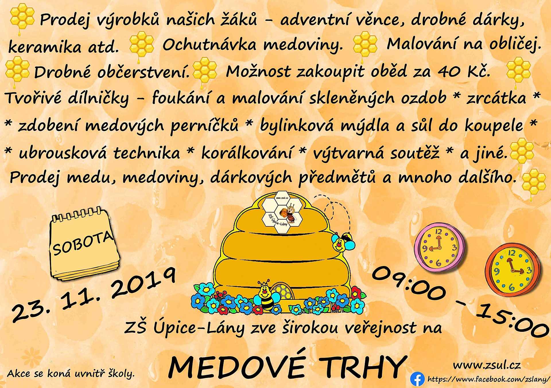 Základní škola Úpice-Lány zve širokou veřejnost na Medové trhy. Přijďte v sobotu 23. 11. 2019 mezi 9:00 a 15:00 hodinou do školy na Lánech a vyberte si některý z výrobků našich žáků, ochutnejte medovinu a další dobroty. Připraveny budou také tvořivé dílničky, výtvarná soutěž, malování na obličej a mnoho dalšího.