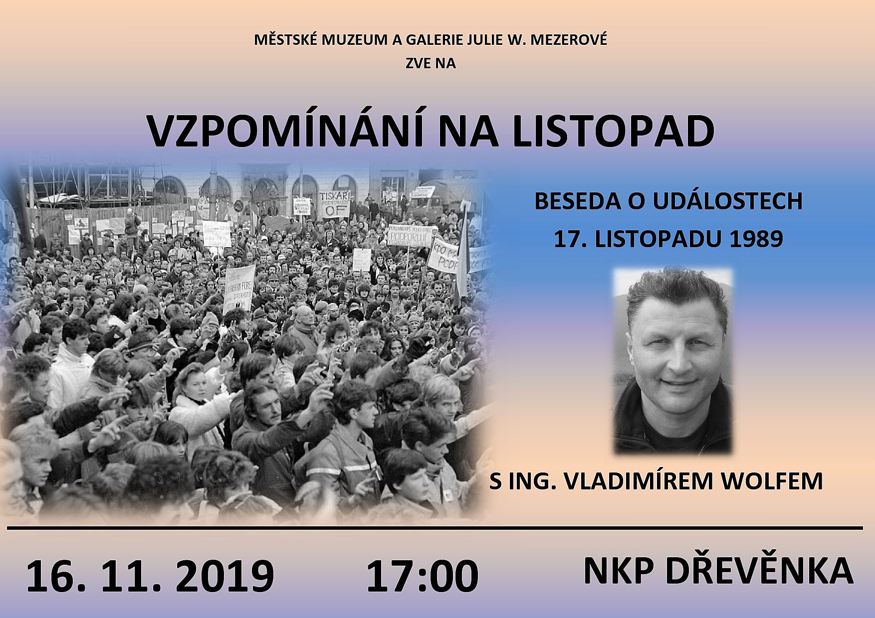Městské muzeum a galerie Julie W. Mezerové zve na Vzpomínání na listopad. Beseda s Ing. Vladimírem Wolfem se uskuteční v sobotu 16. 11. 2019 od 17:00 hodin v Úpici na Dřevěnce.