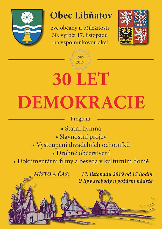 Obec Libňatov zve občany u příležitosti 30. výročí 17. listopadu na vzpomínkovou akci 30 let demokracie, která se koná v neděli 17. 11. 2019 od 15:00 hodin u lípy svobody u požární nádrže. Více o programu se dočtete na plakátu.