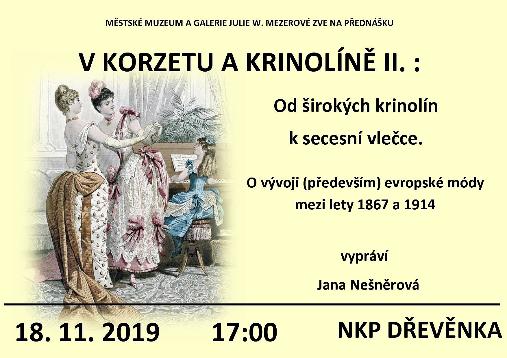 Městské muzeum Julie W. Mezerové zve na přednášku V korzetu a krinolíně II. O vývoji především evropské módy mezi lety 1867 a 1914 vypráví Jana Nešněrová. Přednáška se koná v pondělí 18. 11. 2019 od 17:00 hodin na Dřevěnce.