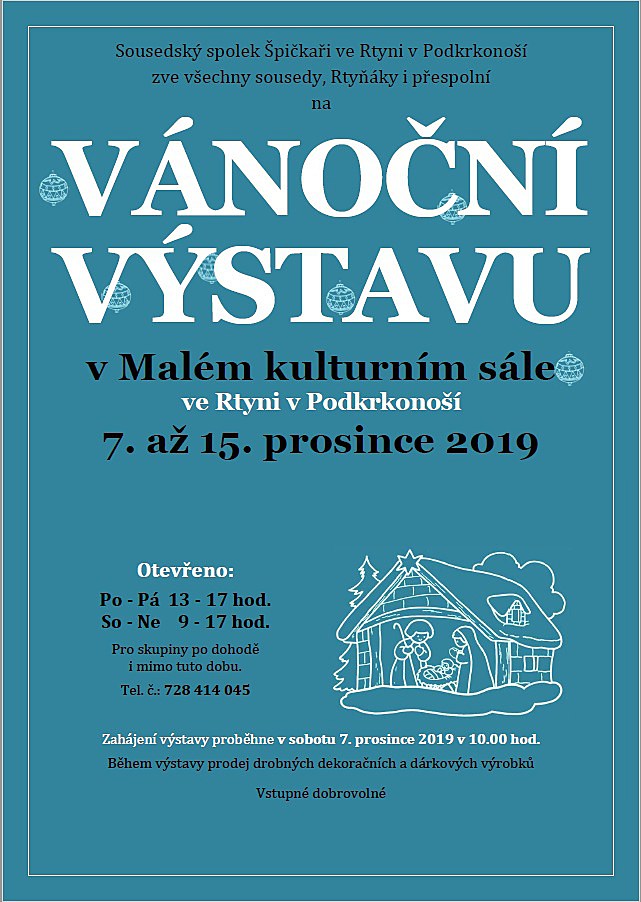 Sousedský spolek Špičkaři ve Rtyni v Podkrkonoší zve všechny sousedy, Rtyňáky i přespolní na Vánoční výstavu, která se koná v malém kulturním sále od 7. do 15. prosince 2019. Vstupné dobrovolné. Zahájení výstavy proběhne v sobotu 7. prosince 2019 v 10:00 hodin.