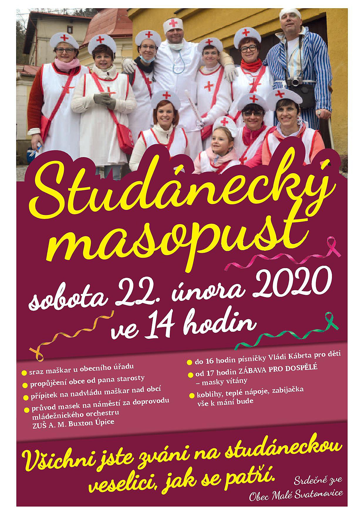 Obce Malé Svatoňovice Vás srdečně zve na Studánecký masopust, který se koná v sobotu 22. února 2020 ve 14:00 hodin. Program naleznete na plakátu. Přejeme hezkou zábavu!