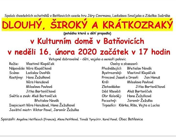 Spolek divadelních ochotníků v Batňovicích uvede známou divadelní hru Járy Cimrmana, Ladislava Smoljaka a Zdeňka Svěráka. Přijďte se pobavit do Kulturního domu v Batňovicích v neděli 16. února 2020!