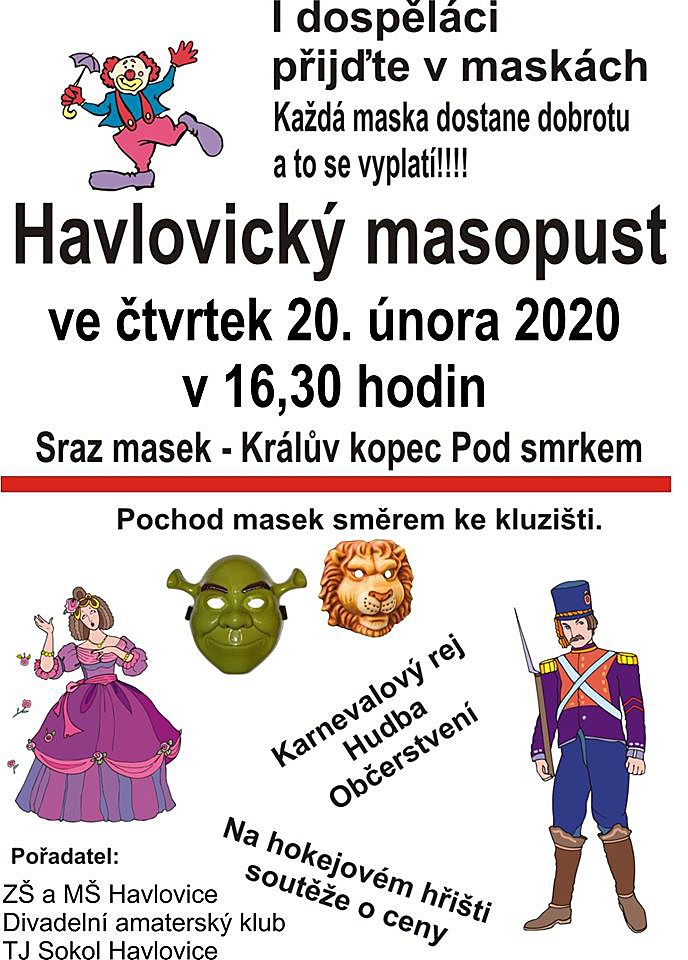 Havlovický masopust je akce pro malé i velké! Bude se konat ve čtvrtek 20. února od 16,30 hodin. Pochod masek bude pokračovat směrem ke kluzišti a každá maska dostane dobrotu. Na hokejovém hřišti bude připravena soutěž o ceny, hudba a občerstvení!