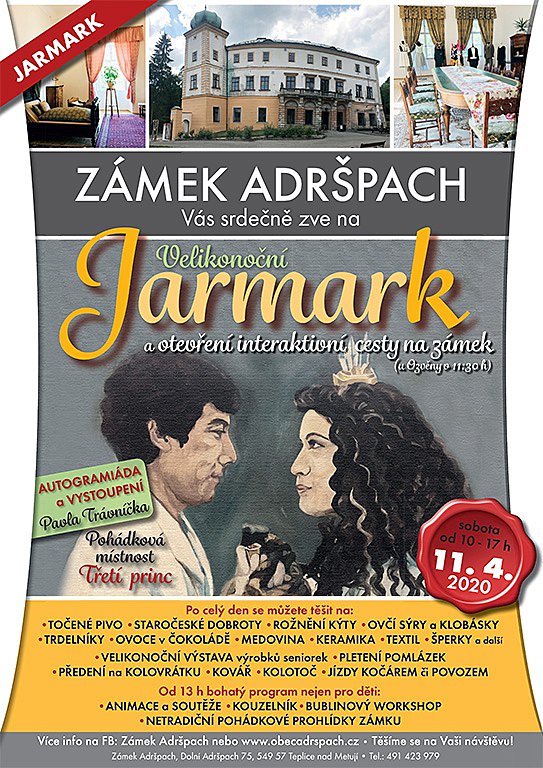 Zámek Adršpach Vás zve na Velikonoční Jarmark a zároveň i otevření interaktivní cesty na zámek. Součástí tohoto dne plného zábavy a dobrot bude i autogramiáda Pavla Trávíčka. Přijďte si užít tento den do Adršpachu, určitě nebudete litovat!
