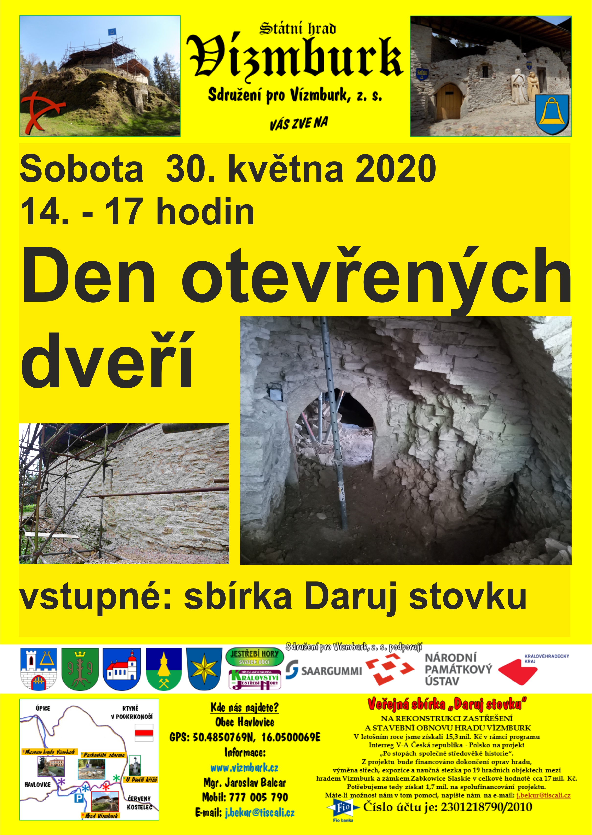 V sobotu 30. května 2020 se přijďte podívat na hrad Vízmburk. Ukážeme vám výsledky dosavadních oprav, seznámíme vás s pokračujícím projektem, nasytíme vás a také napojíme. Akce bude probíhat od 14 do 17 hodin. Přijďte pobejt. Pozvánka pokračuje v příloze.