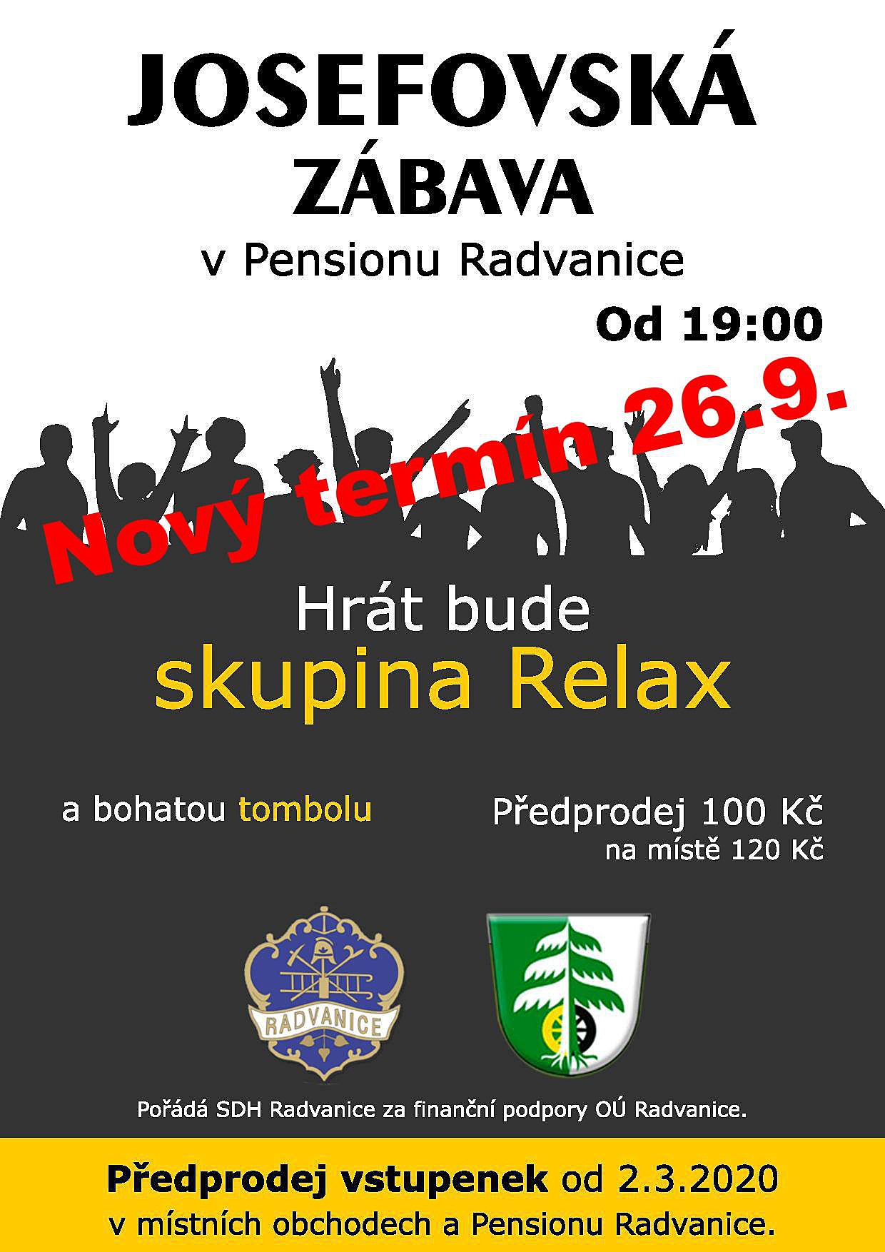 V sobotu 26.září se bude v Penzionu Radvanice konat Josefovská zábava. Těšit se můžete na skupinu Relax a bohatou tombolu.
