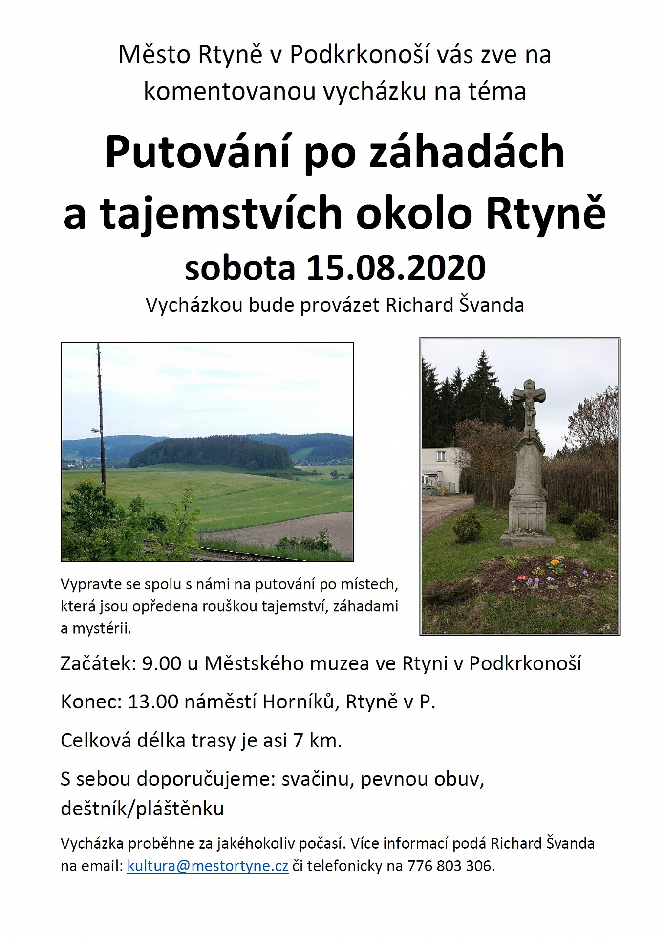 Město Rtyně v Podkrkonoší Vás zve na komentovanou vycházku, která se uskuteční v sbotu 15.srpna 2020. Začátek je v 9hodin u Městského muzea. Více informací naleznete na plakátu.