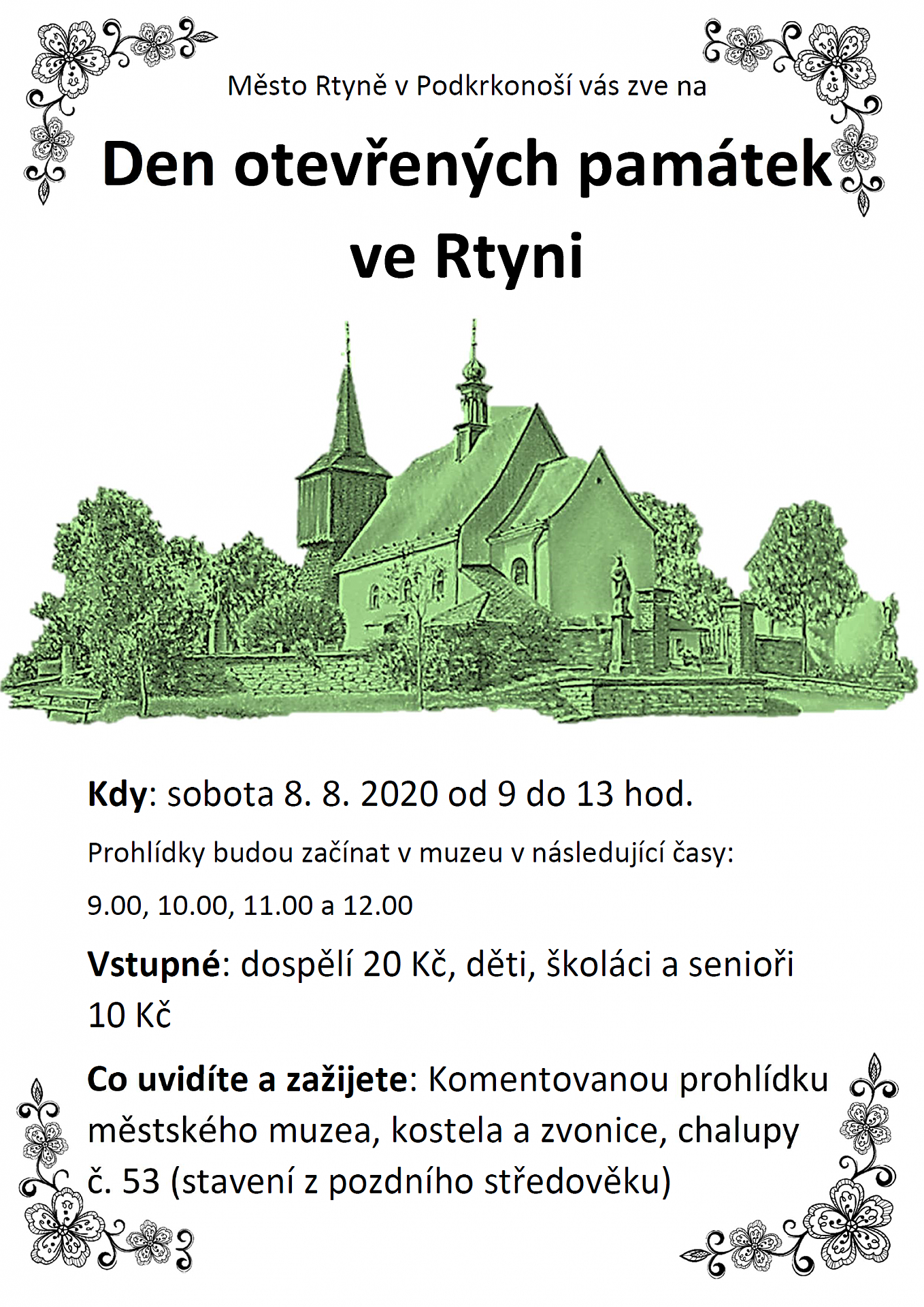 Město Rtyně v Podkrkonoší Vás zve v sobotu 8.srpna 2020 do muzea, kostela, zvonice a chalupy č.53. Můžete se těšit na komentované prohlídky! Více informací na plakátu.