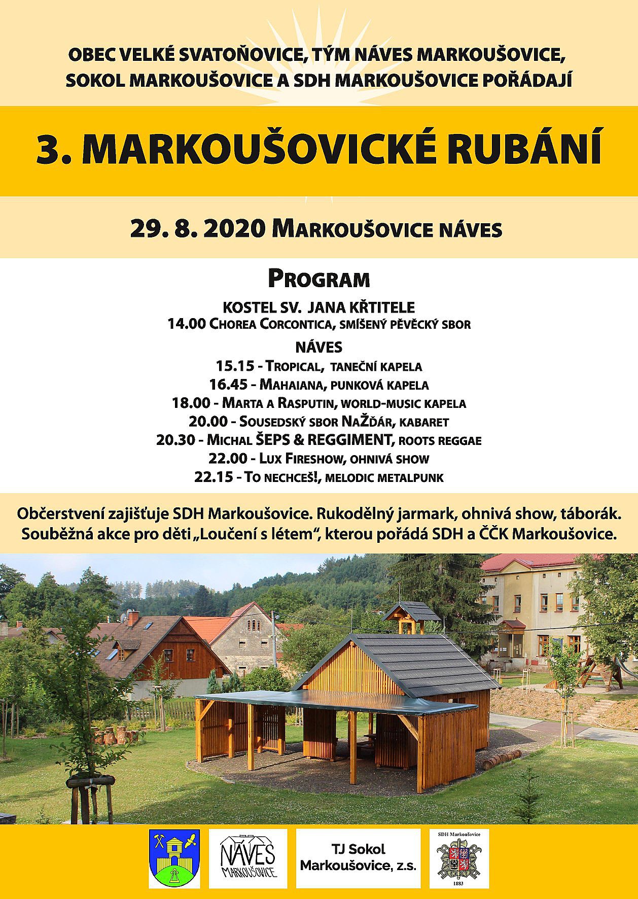 Obec Velké Svatoňovice, Tým Náves Markoušovice, Sokol Markoušovice a SDH Markoušovice pořádají již třetí Markoušovické rubání a to v sobotu 29. srpna 2020. Program je opravdu nabitý a máte se na co těšit! Více informací naleznete na plakátu.