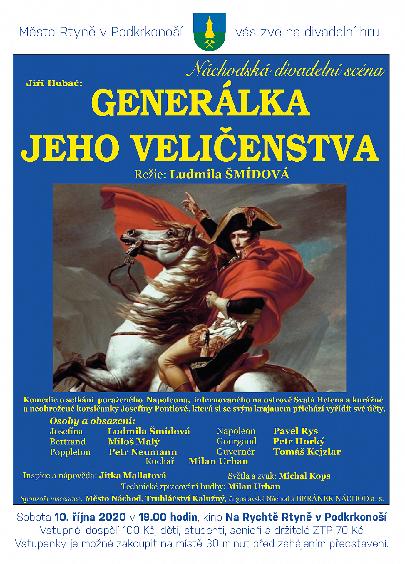 Město Rtyně v Podkrkonoší Vás zve na divadelní hru Generálka jeho veličenstva, komedii o setkání poraženého Napoleona, která se bude konat v sobotu 10. října 2020 od 19 hodin v kině Na Rychtě. Více informací naleznete na plakátu.