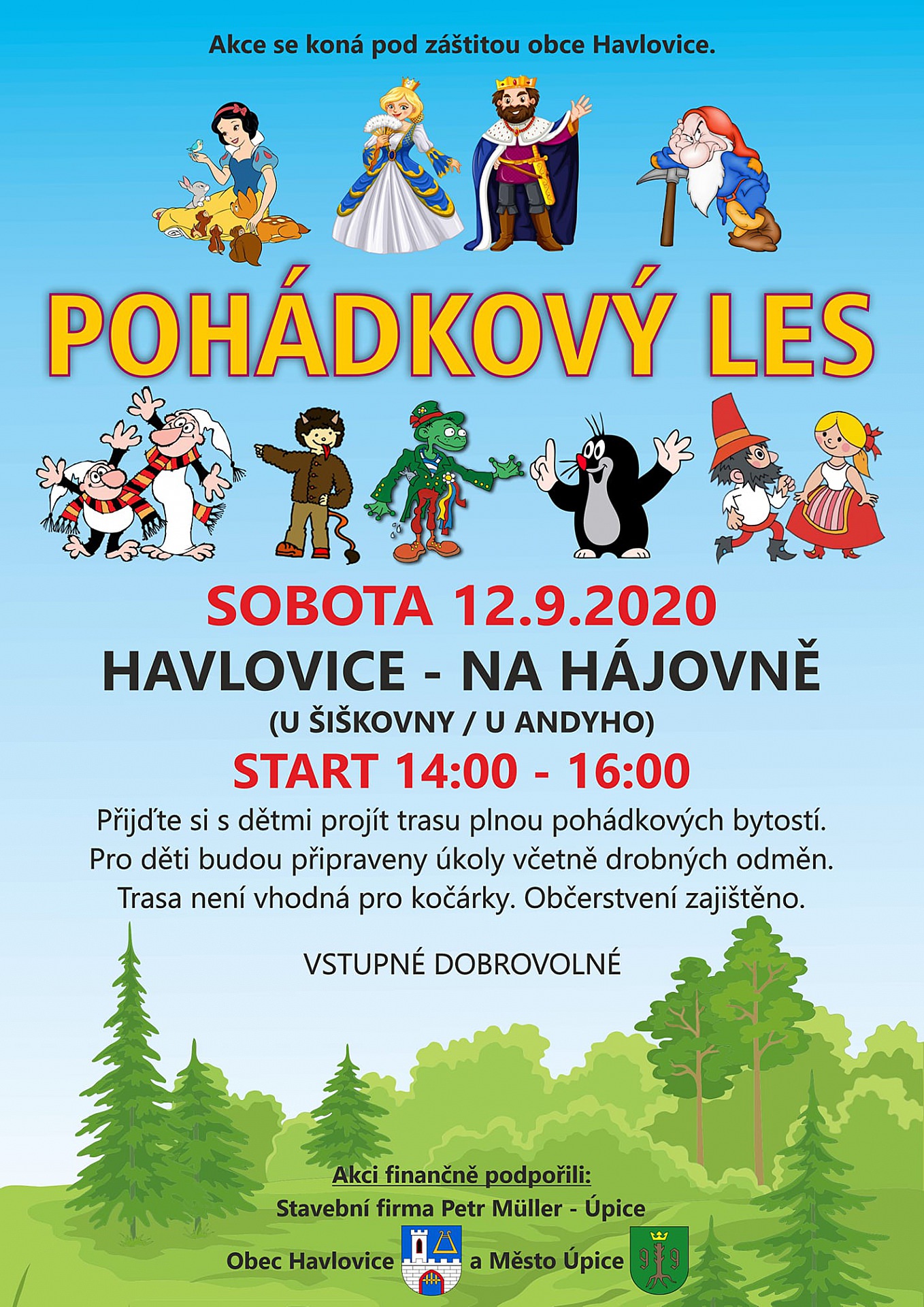Tato akce se uskuteční v sobotu 12.9.2020 pod záštitou obce Havlovice a měsa Úpice. Děti se mohou těšit na trasu plnou pohádkových bytostí, úkolů a drobných odměn.