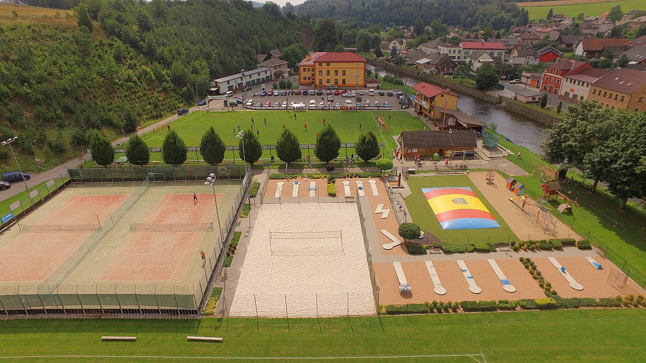Areál nabízí dvě travnatá fotbalová hřiště, asfaltové hřiště, dva tenisové kurty, hřiště pro beach volejbal, 14 drah pro minigolf, pétanque, dětské hřiště, trampolínu a stůl na ping pong. Areál má vlastní občerstvení, ubytování, šatny, parkoviště a stojan na kola, nově nabízí také půjčovnu koloběžek.