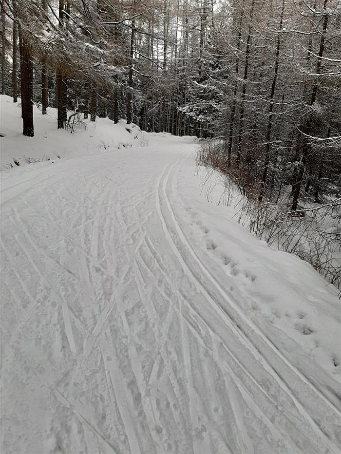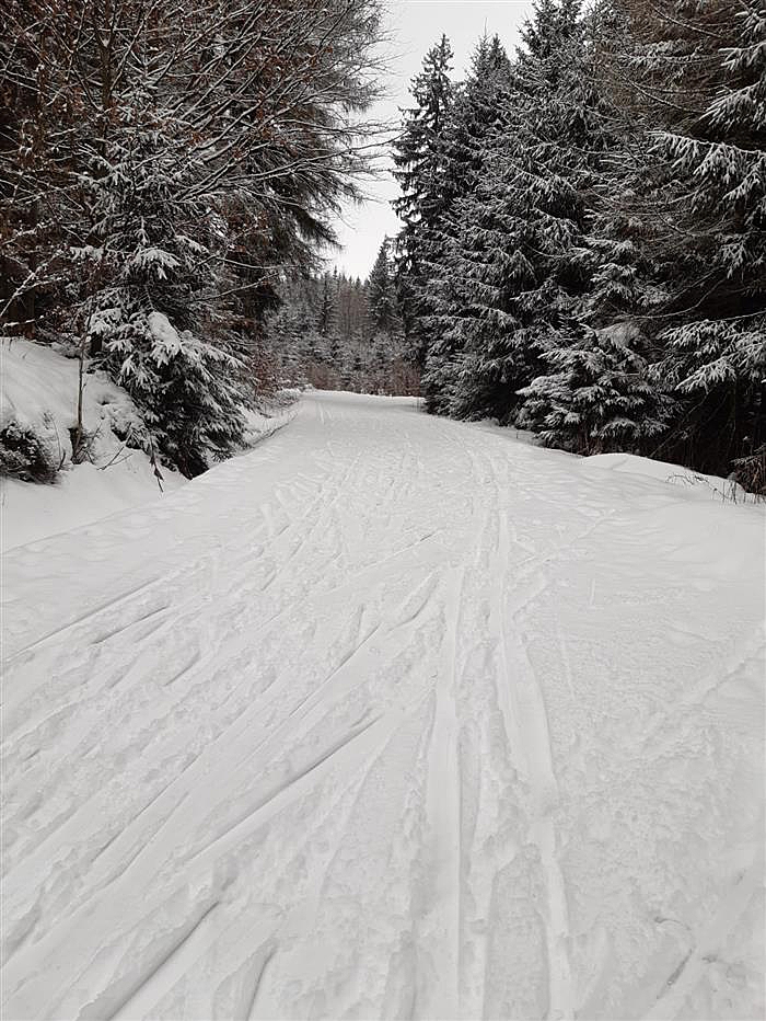 Noční chumelení nám přineslo slabou vrstvu prašanu do stopy. Z Odolova k Bílému Kolu a na Paseky podmínky vynikající. Trochu problém s mazáním. Kdo bruslí, není co řešit - tvrdý podklad. Teplota mírně pod nulou.