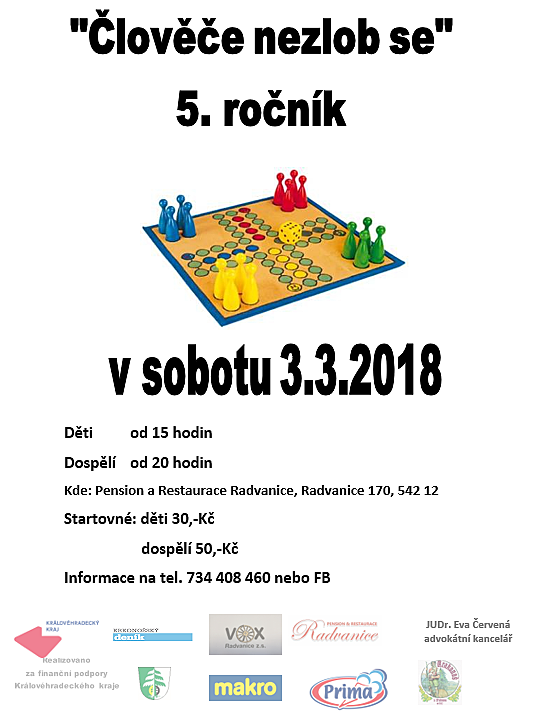 Jste srdečně zváni do Restaurace a Penzionu Radvanice! V sobotu 3. 3. 2018 se tu koná již 5. ročník "Člověče nezlob se" v kategorii pro děti i pro dospělé. Více informací a kontakt na plakátu.