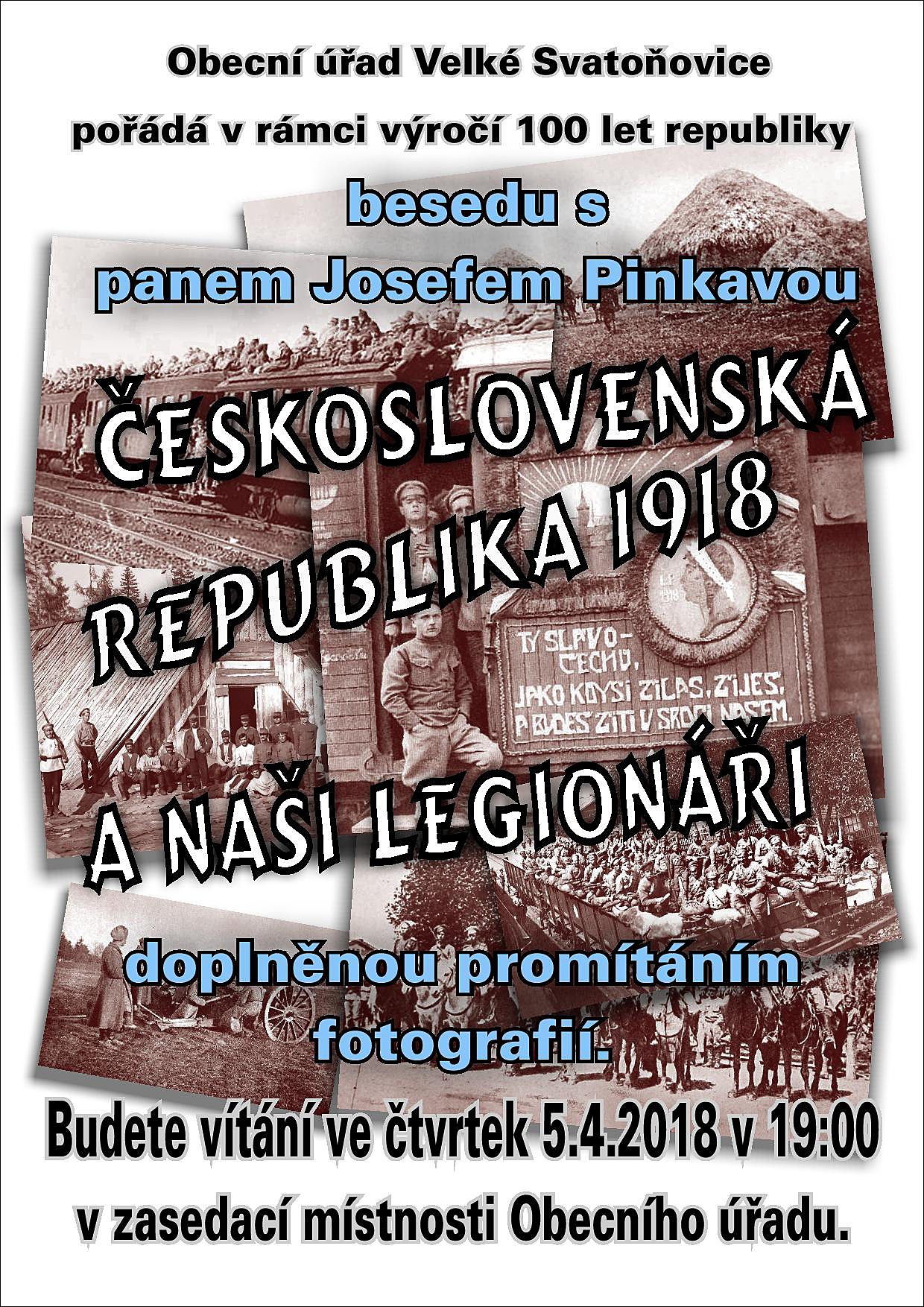 Obecní úřad Velké Svatoňovice pořádá, 5. 4. 2018 od 19:00 v zasedací místnosti Obecního úřadu, v rámci výročí 100 let republiky besedu s panem Josefem Pinkavou Československá republika 1918 a naši legionáři. Beseda je doplněna o promítání fotografií. Více informací na plakátu.