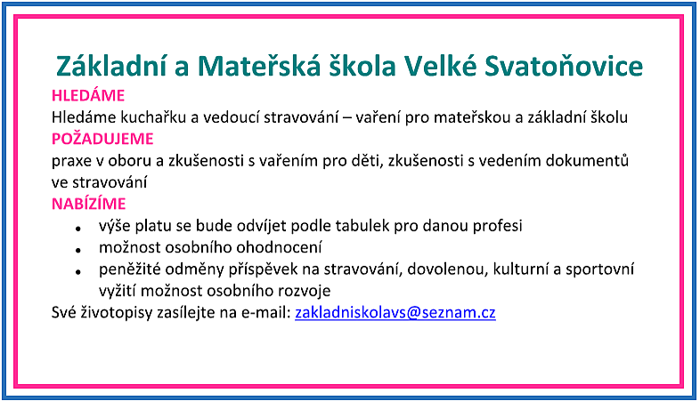 ZŠ a MŠ Velké Svatoňovice přijme kucahřku a vedoucí stravování - vaření pro mateřskou a základní školu. Více informací naleznete na plakátu.