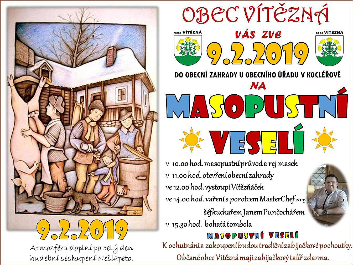 V sobotu 9. února 2019 se koná v obcí Vítězná masopustní veselí. Od 10 hodin začne masopustní průvod a rej masek. Je pro Vás připraveno vaření s porotcem MasterChef 2019 a šéfkuchařem Janem Punčochářem. Můžete se těšit i na bohatou tombolu. K ochutnání a zakoupení budou tradiční zabíjačkové pochoutky. Atmosféru doplní po celý den hudební seskupení Nešlapeto. Více informací na plakátu.
