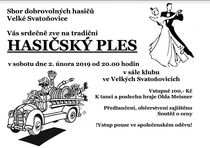 Sbor dobrovolných hasičů Velké Svatoňovice Vás srdečně zve na tradiční hasičský ples, který se koná v sobotu 2. února 2019 od 20:00 hodin v sále klubu ve Velkých Svatoňovicích. Vstupné 100 Kč. Více informací na plakátu.
