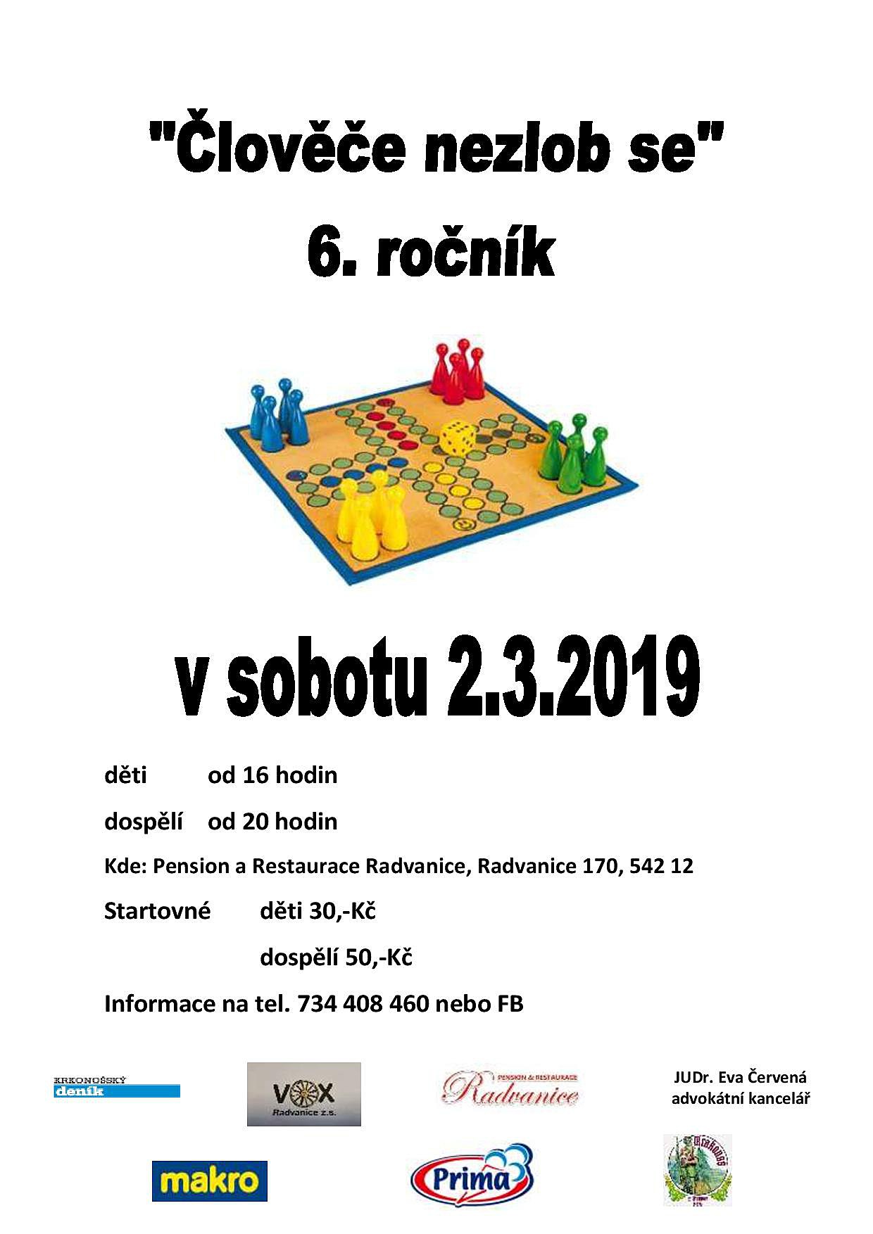 V pensionu a restauraci Radvanice se koná v sobotu 2. března 6. ročník Člověče nezlob se. Začátek akce je pro děti v 16 hodin a pro dospělé v 20 hodin. Startovné pro děti do 15 let je 30,-Kč a pro dospělé 50,-Kč. Jsou připraveny pěkné ceny. Více informací na plakátu.