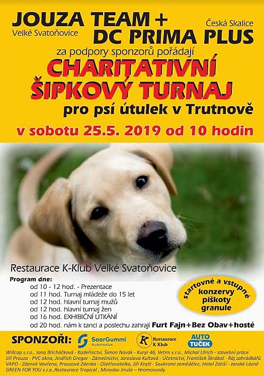 Jouza Team Velké Svatoňovice a DC Prima Plus Česká Skalice za podpory sponzorů pořádají Charitativní šipkový turnaj pro psí útulek v Trutnově. Akce se koná v sobotu 25. května 2019 od 10:00 hodin. Více informací na plakátě.