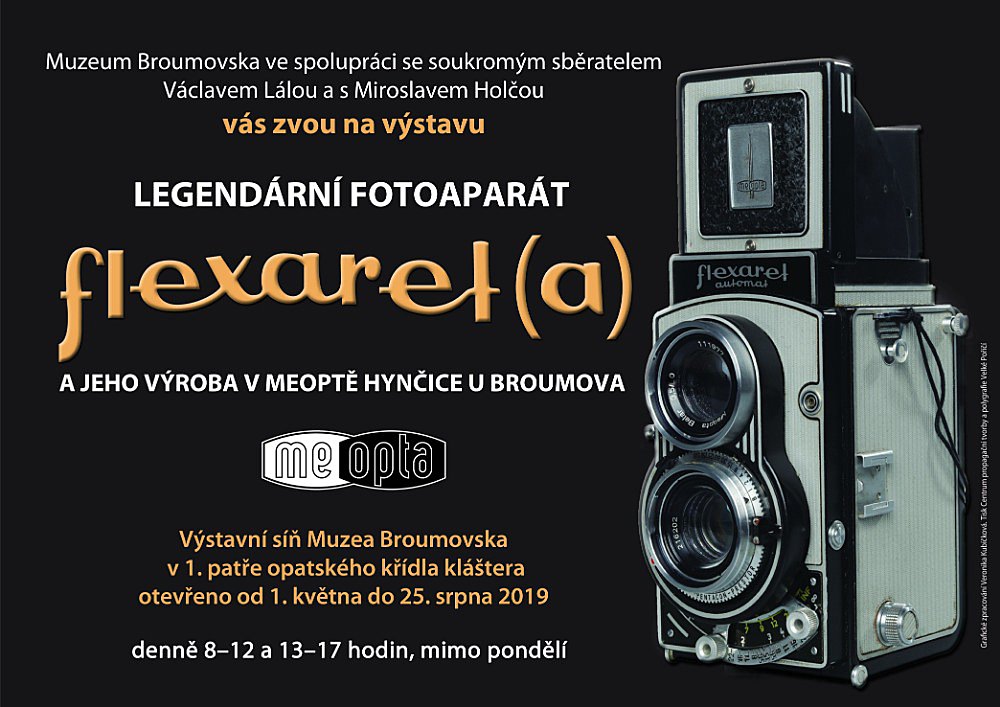 Muzeum Broumovska ve spolupráci se soukromým sběratelem Václavem Lálou a s Miroslavem Holčou vás zvou na výstavu Legendární fotoaparát flexarel(a) a jeho výroba v Meoptě Hynčice u Broumova. Výstava je zpřístupněna od 1. května do 25. srpna 2019 v 1. patře opatského křídla kláštera. Otevřeno denně mimo pondělí od 8-12 a 13-17 hodin.