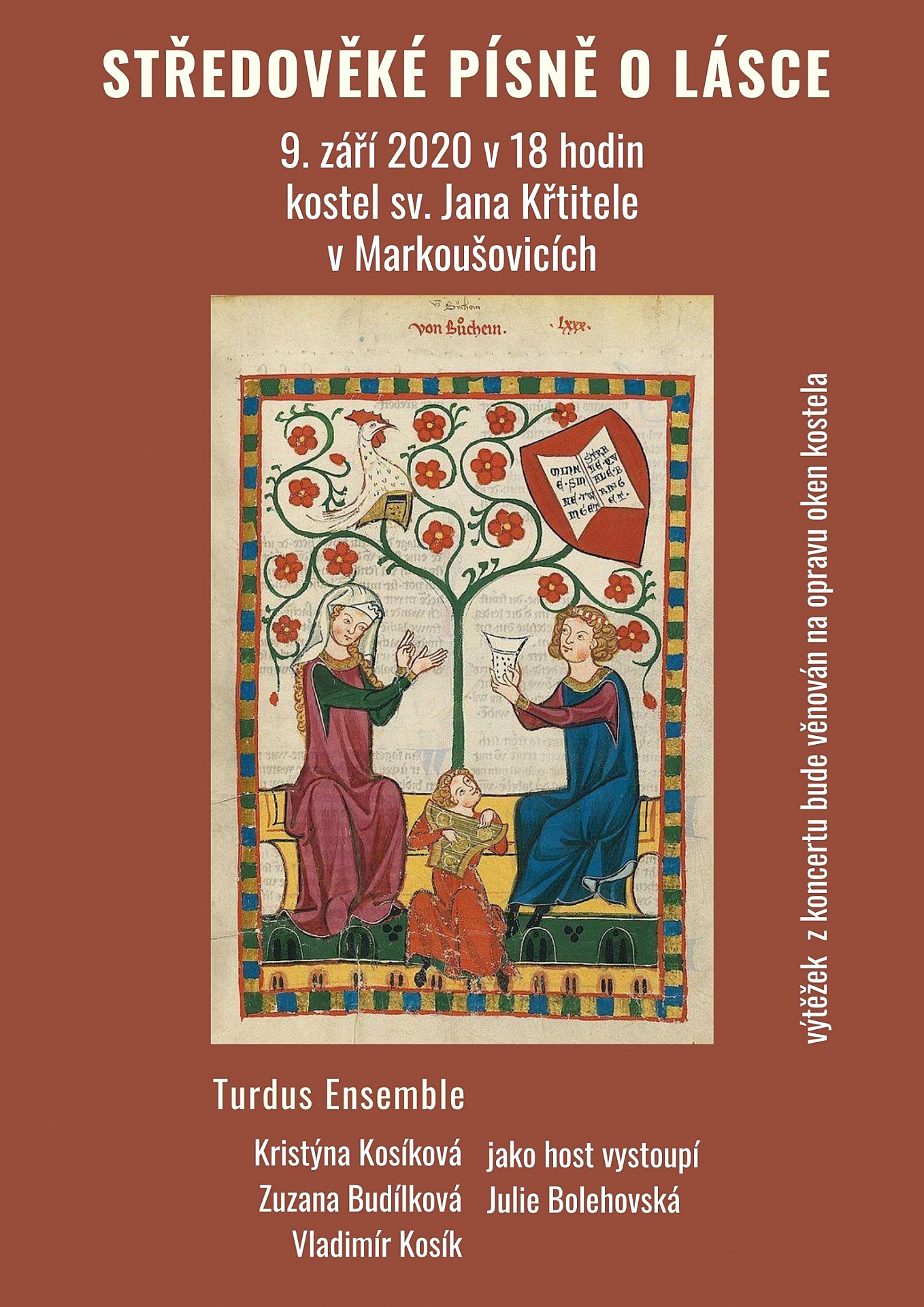 Ve středu 9. září 2020 se v kostele sv. Jana Křtitele v Markoušovicích rozezní středověkých písní o lásce. Výtěžek z akce bude navíc věnován na opravu oken kostela - to je o důvod víc proč přijít.