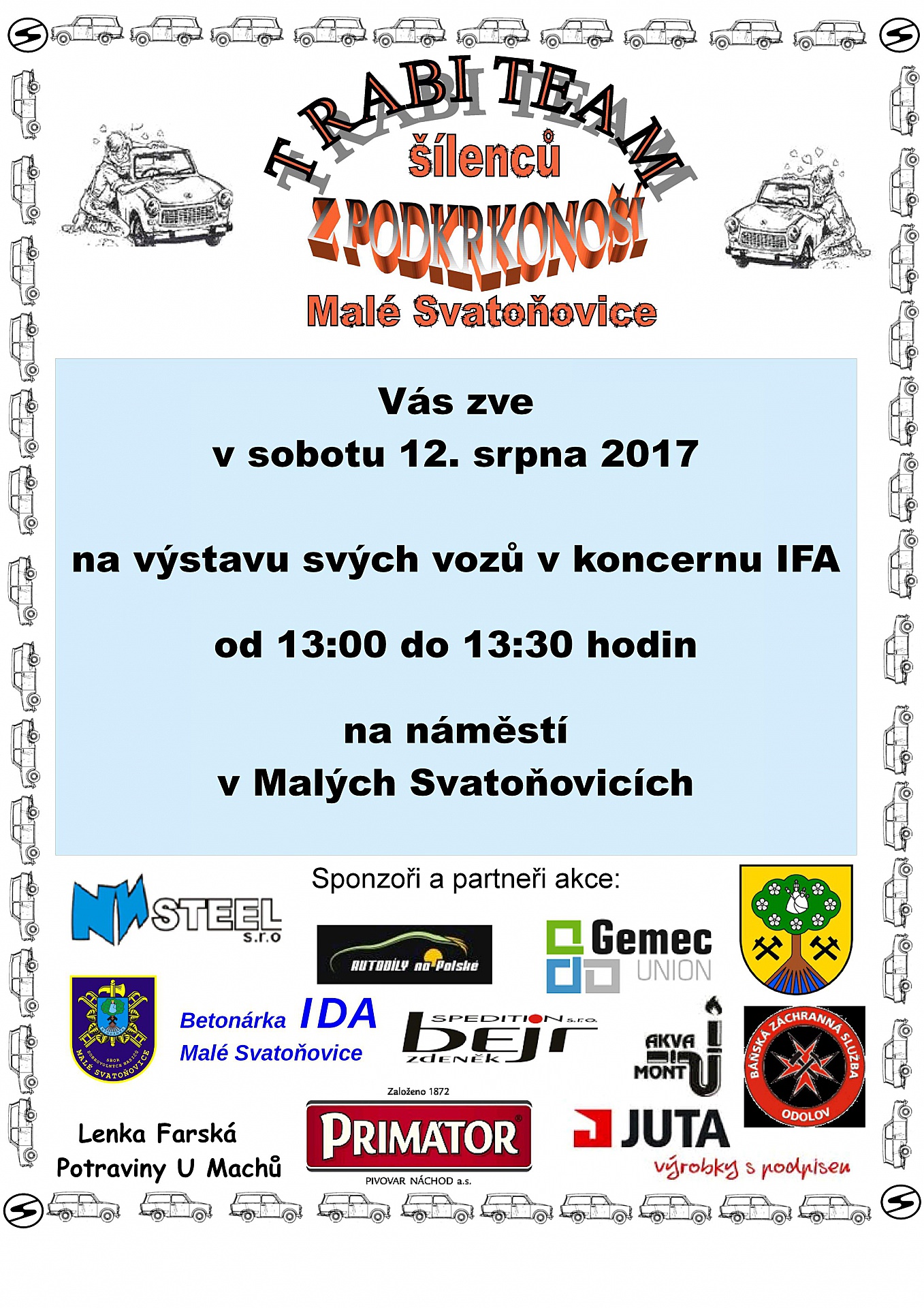 Trabi Team šílenců z Podkrkonoší pořádá v sobotu 12. srpna 2017 výstavu svých vozů koncernu IFA - od 13:00 do 13:30 hodin na náměstí v Malých Svatoňovicích.