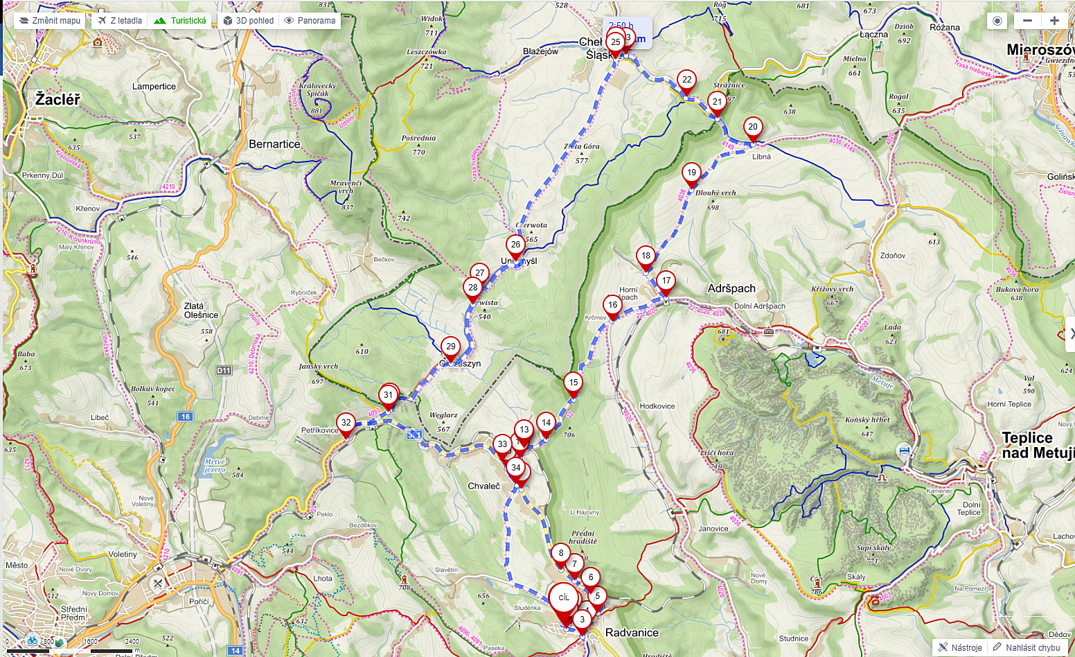 Radvanice – Chvaleč – Horní Adršpach – Libná - Chelmsko Slaskie (PL) - Okrzeszyn (PL) – Chvaleč - Radvanice