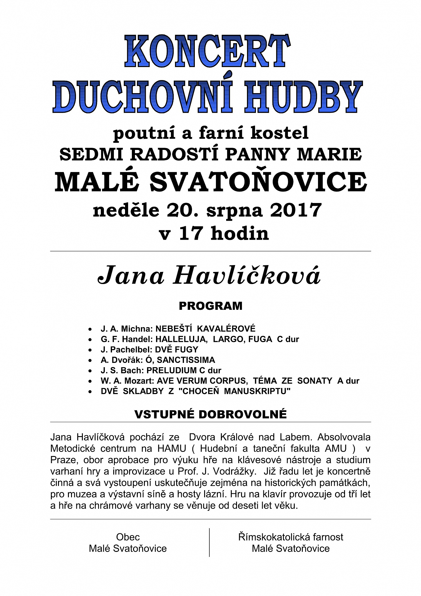 Obec Malé Svatoňovice a Římskokatolická farnost Malé Svatoňovice zvou na koncert Jany Havlíčkové.