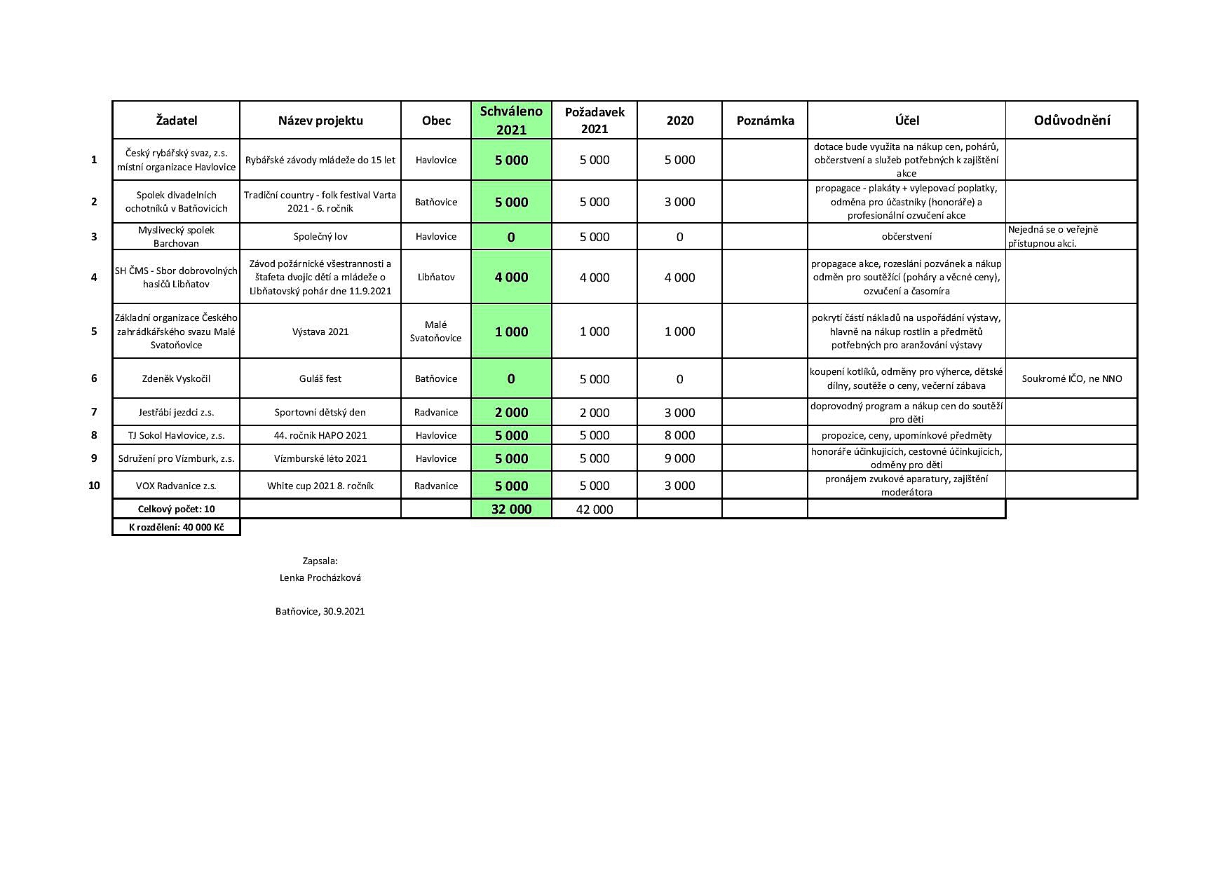 Na Výboru Svazku obcí Jestřebí hory konaného 30. září 2021 bylo rozhodnuto o rozdělení finančních darů pro neziskové organizace na území svazku. Spolky byly pro tento rok podpořeny částkou 32 000 Kč.