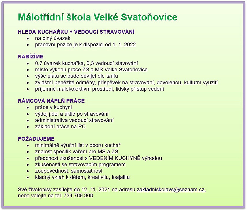 ZŠ a MŠ Velké Svatoňovice hledá kuchařku + vedoucí stravování. Bližší informace jsou na přiloženém letáku. Zájemci mohou své životopisy zasílat do 12. listopadu 2021 na adresu zakladniskolavs@seznam.cz. Nebo je možné volat na telefonní číslo 734 769 308.