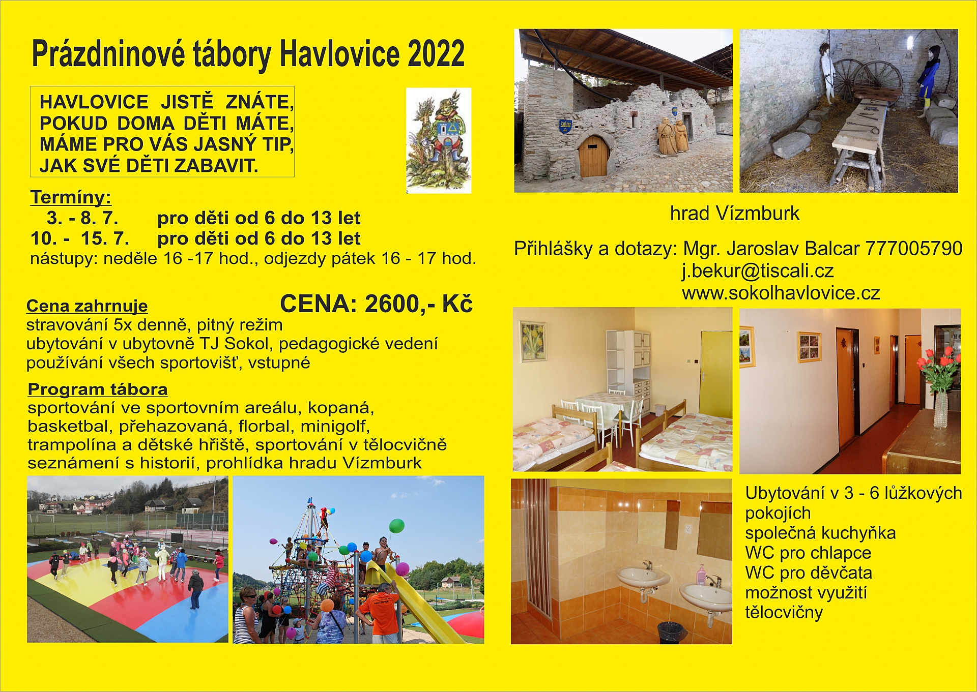 Také v letošním roce TJ Sokol Havlovice organizuje sportovní tábory pro děti. Probíhat budou vždy od neděle do pátku. Děti zde zažijí nevšední chvíle při sportování, poznávání přírody a hradu Vízmburk. Připraveny jsou dva turnusy. Bližší informace a přihlášku najdete níže.