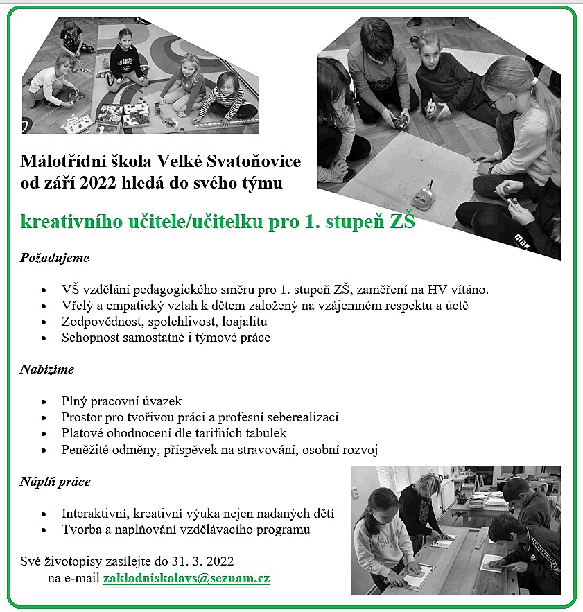 ZŠ a MŠ Velké Svatoňovice hledá kreativního učitele/učitelku pro 1. stupeň ZŠ. Zájemci mohou své životopisy zasílat do 31. 3. 2022 na adresu zakladniskolavs@seznam.cz.