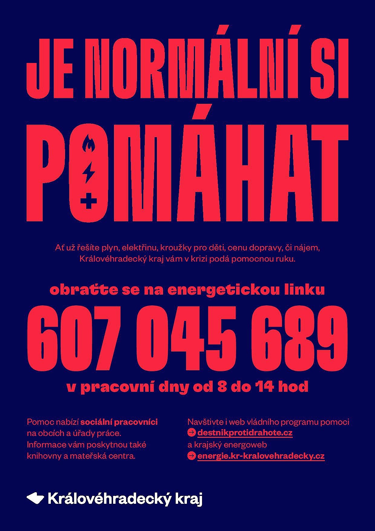 Královéhradecký kraj vám v krizi podává pomocnou ruku. Informace vám poskytnou na energetické lince 607 045 689 v pracovní dny od 8:00 do 14?00 hod., nebo navštivte webové stránky ZDE.