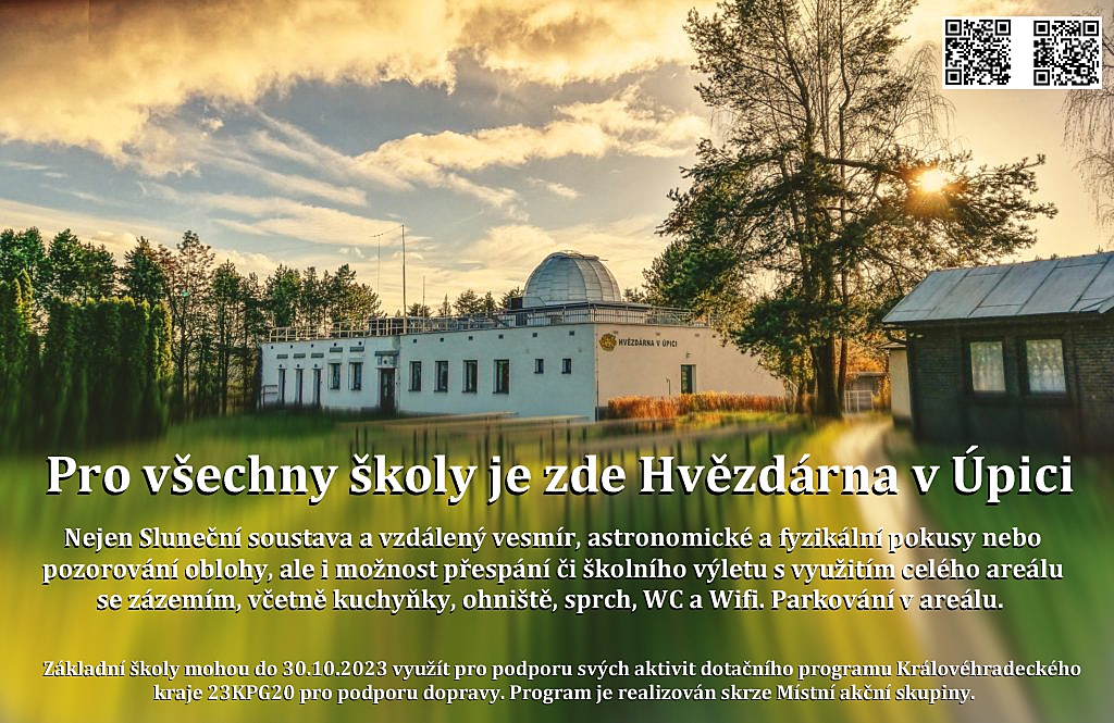 Základní školy mohou do 30.10.2023 využít pro podporu svých aktivit dotačního programu Královéhradeckého kraje, který částečně přispívá na dopravu žáků do kulturních a vzdělávacích institucí kraje. Mezi tyto instituce patří i Hvězdárna v Úpici. Uvedený dotační program je realizován skrze místní akční skupiny, v území ORP Trutnov kontaktujte MAS Království – Jestřebí hory, o.p.s. Kontakty jsou ZDE.