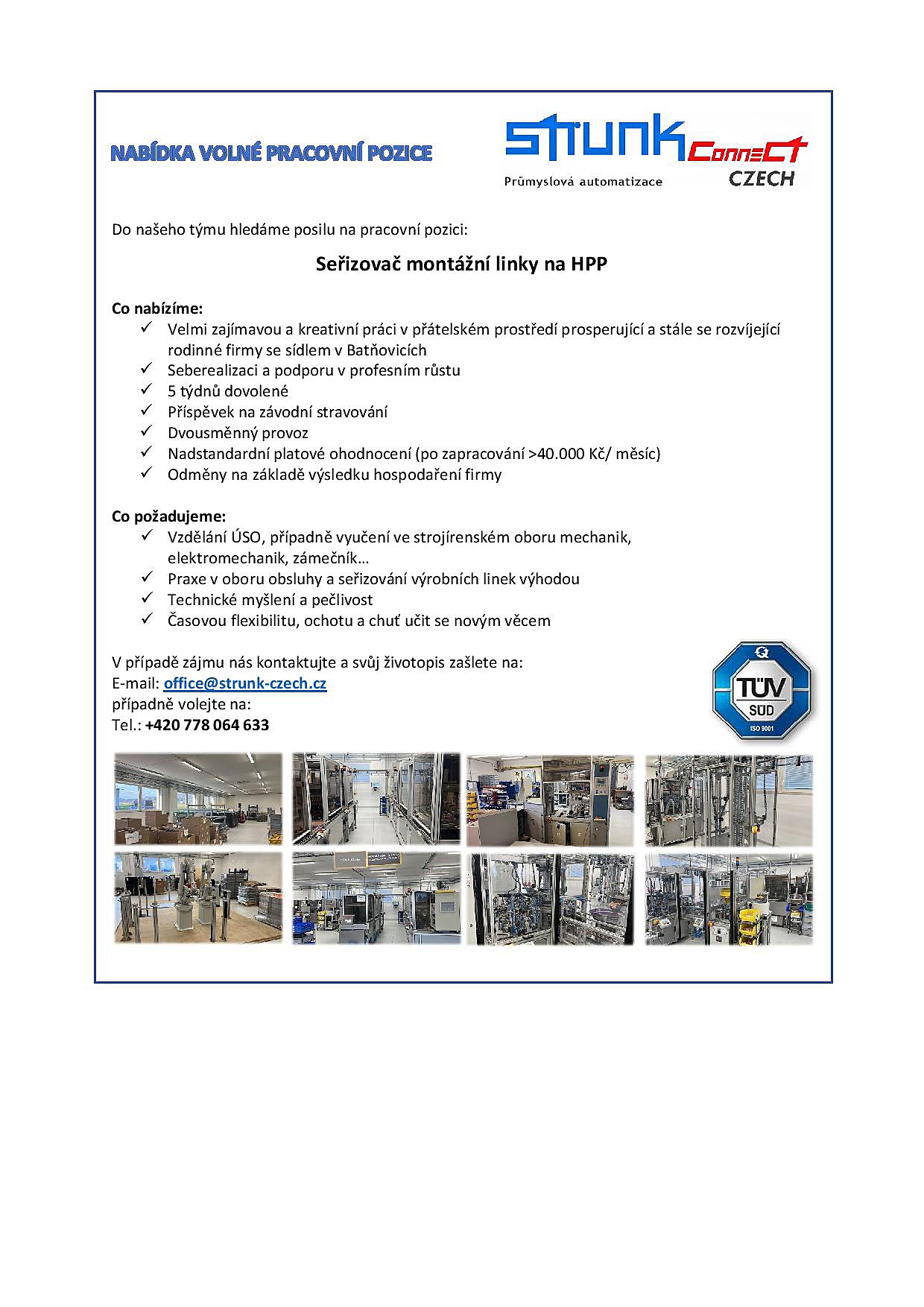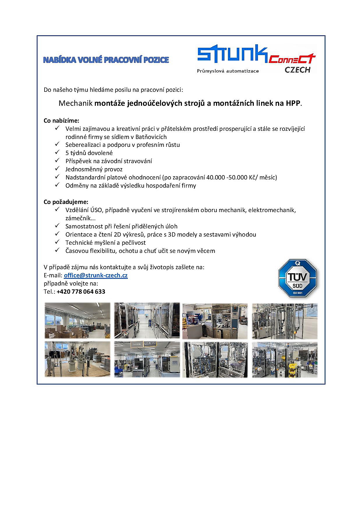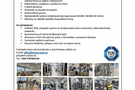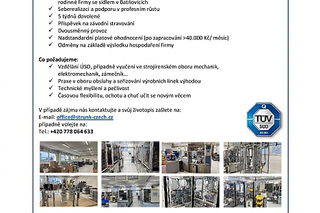 Firma Strunk Connect CZ s.r.o. z Batňovic, zabývající se vývojem konstrukce a výrobou strojů pro průmyslovou automatizaci, nabízí volné pracovní pozice.