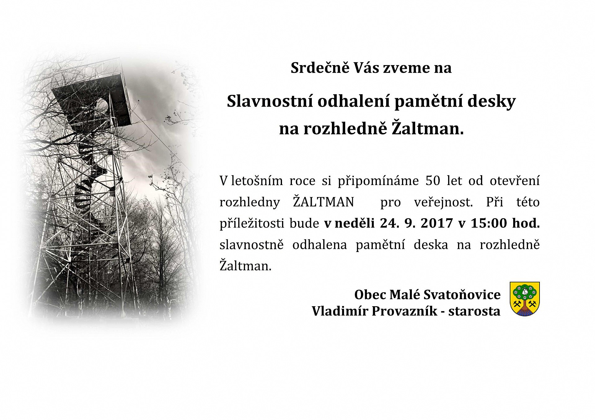 V letošním roce si připomínáme 50 let od otevření rozhledny ŽALTMAN pro veřejnost. Při této příležitosti bude v neděli 24. 9. 2017 v 15 hodin slavnostně odhalena pamětní deska na rozhledně Žaltman.