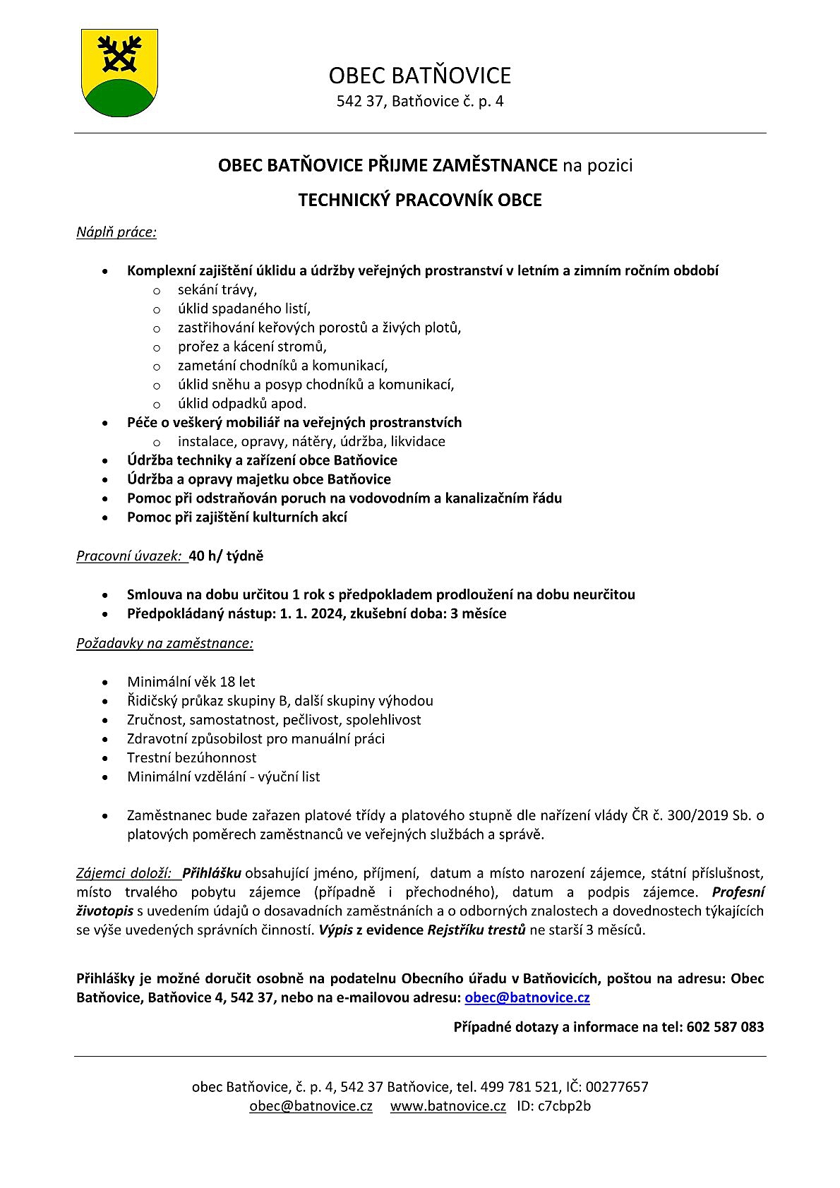 Obec Batňovice přijme zaměstnance na pozici technický pracovník obce.